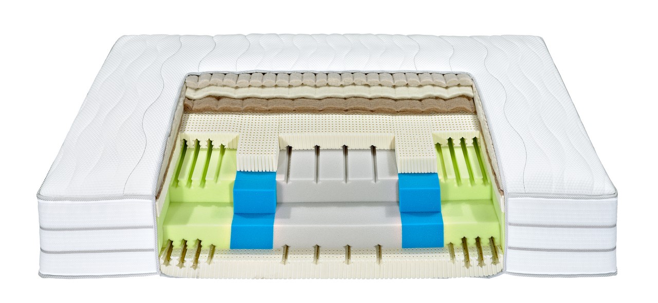 Kern: Hochflexibler Matratzenkern aus atmungsaktiven Kaltschaum Porotex Pro mit Luftzellstruktur und mit anatomisch vermessenen Entlastungs-und Stützzonen. Beidseitig druckentlastende, punktelastische 7-Zonen-Auflagen aus original Talalay 100%-Naturlatex mit vertikaler Airvent-Perforation mit mind. 6'000 Entlüftungsstiften pro m2. Neue, extra weiche Schulterentlastugsaufnahme und stüztende Lordosezone.