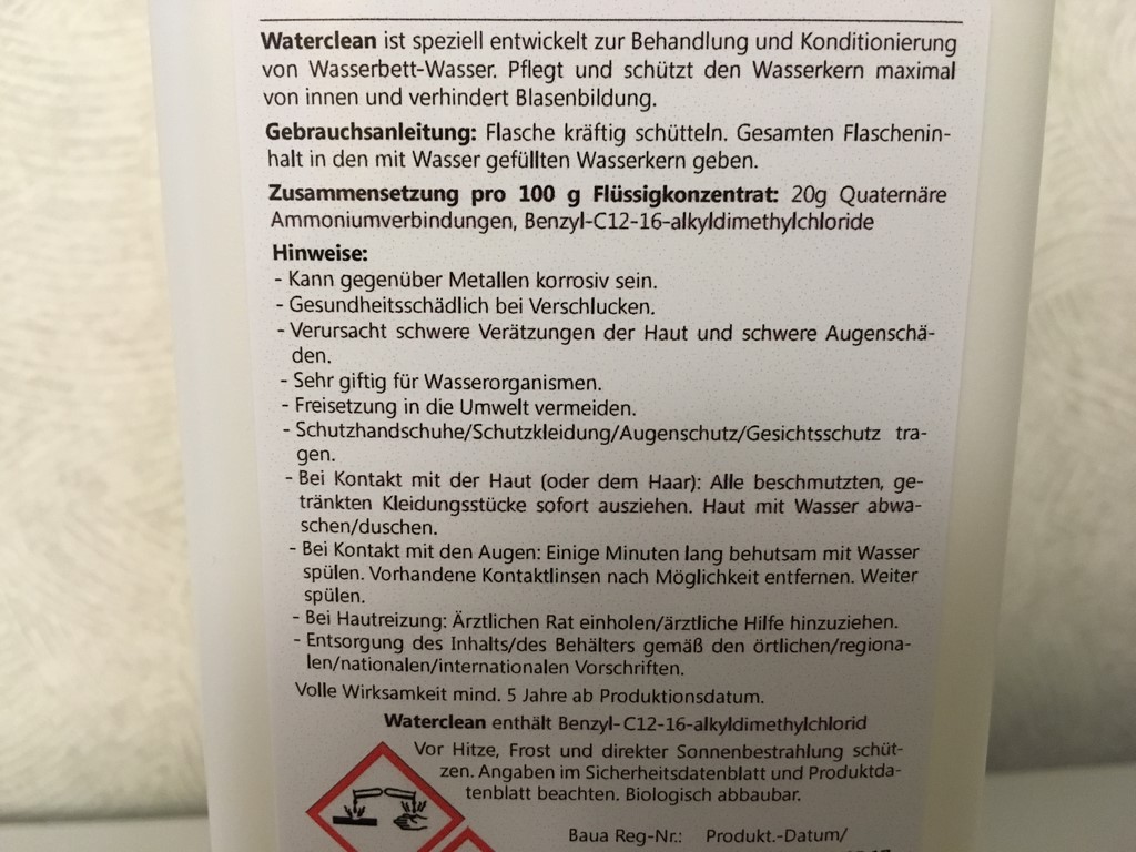 Waterclean ist speziell entwickelt zur Behandlung und Konditionierung von Wasserbett-Wasser. Pflegt und schützt den Wasserkern maximal von innen und verhindert Blasenbildung.