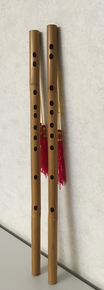 Traditionelle Feng Shui-Flöten mit roten Quasten zu deren Aktivierung.